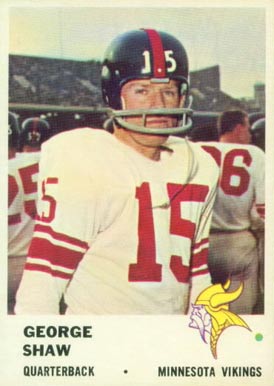 1961 Fleer football card of former pro quarterback George Shaw, who played 8 seasons of professional football, 7 in the NFL with 3 different teams in the mid-1950s to early ’60s and a final season with Denver in the AFL in 1962. He was mostly a backup in his pro days, and in that role was a member of the Baltimore Colts’ 1958 championship club. After retiring he worked for a stock brokerage, and eventually rose to the position of vice president. Shaw passed away in 1998 at the age of 64 after a long struggle with bone marrow cancer.