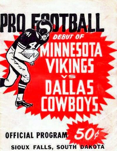 In the past we have featured NFL preseason games on Throwback Thursday, mainly because in the 1960s after the merger, the exhibition contests between NFL and AFL teams were battles for pride. We are featuring another preseason contest this week, played on August 5, 1961, but for another reason. It was a match between the second year expansion Dallas Cowboys and the shiny new expansion Minnesota Vikings, 2 franchises who meet this week. This was the first time the Minnesota franchise took the field in their history, and the game was played in Sioux Falls, South Dakota. It was common in that era for NFL teams to play their exhibition games in non-NFL cities, as the league was still fighting for as much exposure as they could get. South Dakota was not necessarily a good choice however, as the game drew a little less than 5,000 fans, causing the promoters to lose money.The established NFL teams did the new expansion teams no favors in those days, as both the Cowboys in 1960 and Vikings in ’61 were forced to stock their rosters with aging castoffs from the other clubs. The rise of the AFL in 1960 drained the talent pool even more.